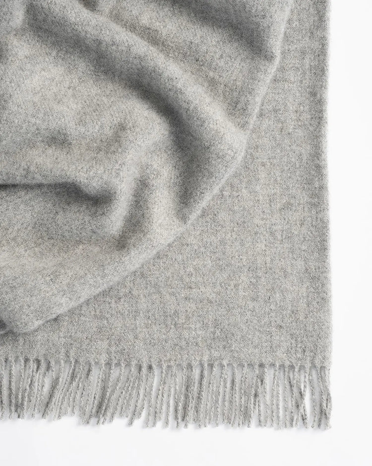 Nevis Ash is a light, steel grey with a rich texture to it. A super cosy throw blanket made from 100% New Zealand lambswool. Texture rich and finished with a tassel border.